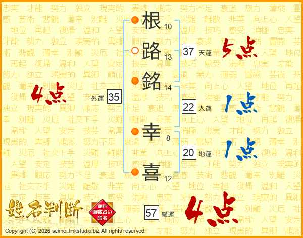 根(10画)路(13画)銘(14画) 幸(8画)喜(12画)