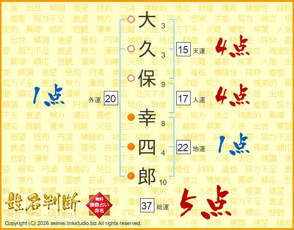 大(3画)久(3画)保(9画) 幸(8画)四(4画)郎(10画)