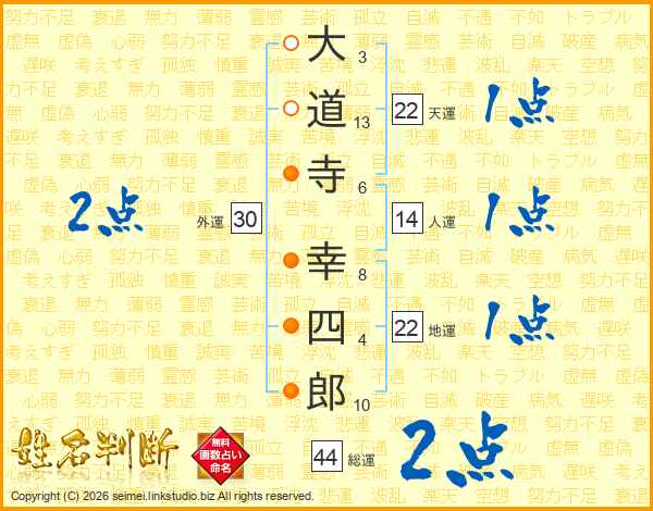 大(3画)道(13画)寺(6画) 幸(8画)四(4画)郎(10画)