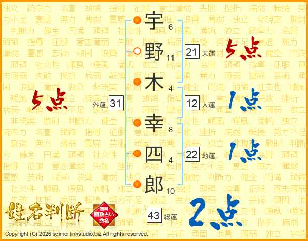 宇野木幸四郎さんの天運は21画の5点!