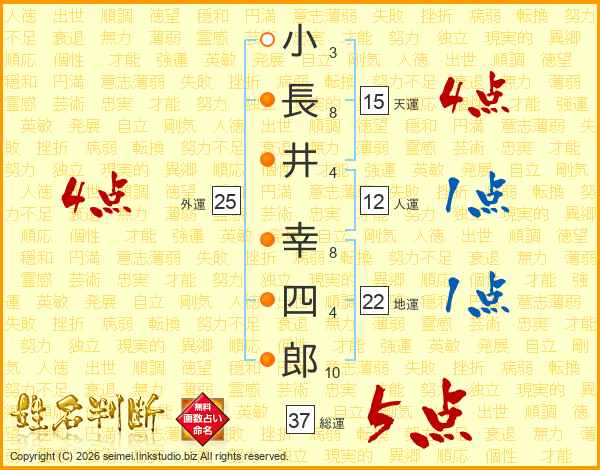 小(3画)長(8画)井(4画) 幸(8画)四(4画)郎(10画)