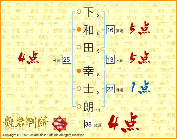 下(3画)和(8画)田(5画) 幸(8画)士(3画)朗(11画)