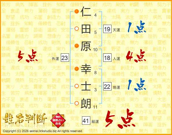 仁(4画)田(5画)原(10画) 幸(8画)士(3画)朗(11画)