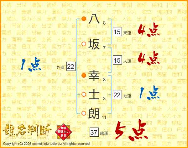八(8画)坂(7画) 幸(8画)士(3画)朗(11画)
