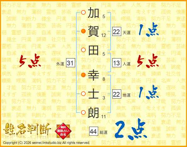 加(5画)賀(12画)田(5画) 幸(8画)士(3画)朗(11画)