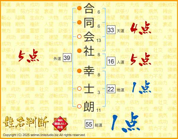 合(6画)同(6画)会(13画)社(8画) 幸(8画)士(3画)朗(11画)