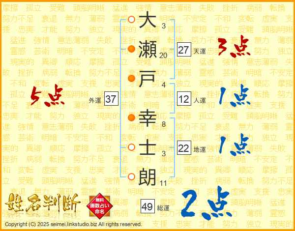 大(3画)瀬(20画)戸(4画) 幸(8画)士(3画)朗(11画)