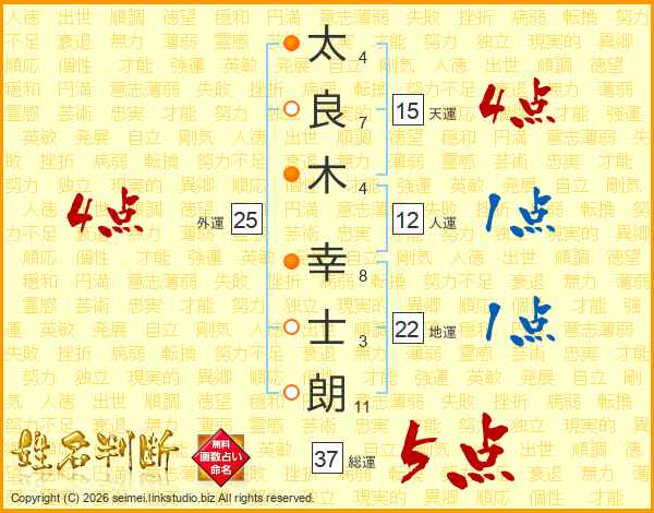 太(4画)良(7画)木(4画) 幸(8画)士(3画)朗(11画)