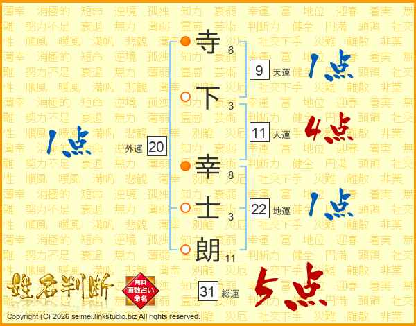 寺(6画)下(3画) 幸(8画)士(3画)朗(11画)