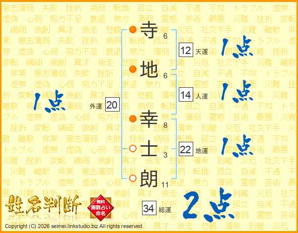 寺(6画)地(6画) 幸(8画)士(3画)朗(11画)