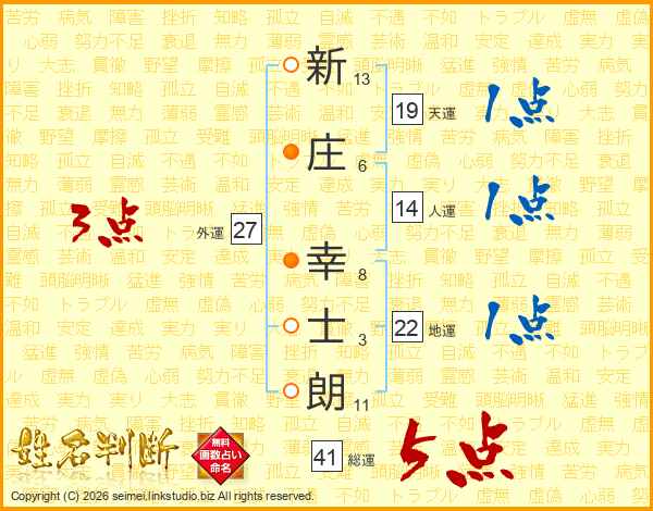 新(13画)庄(6画) 幸(8画)士(3画)朗(11画)