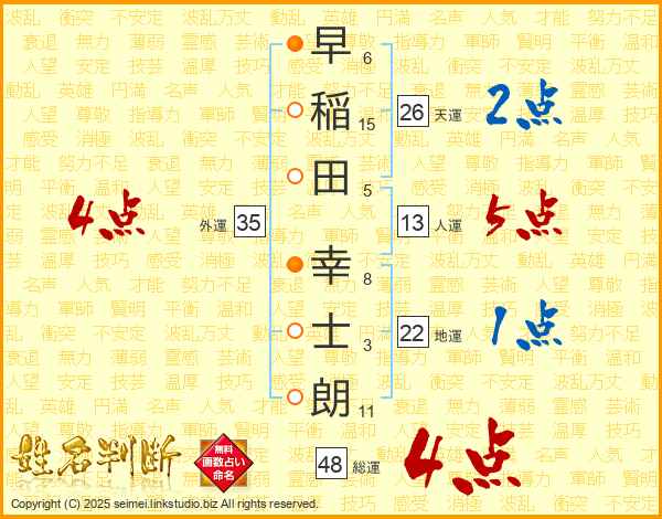 早(6画)稲(15画)田(5画) 幸(8画)士(3画)朗(11画)