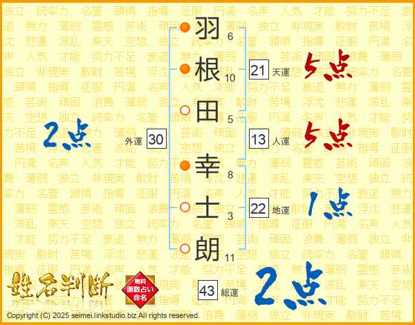 羽(6画)根(10画)田(5画) 幸(8画)士(3画)朗(11画)