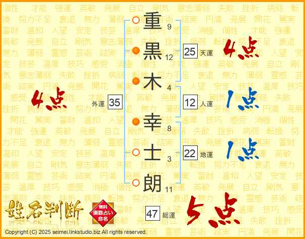 重(9画)黒(12画)木(4画) 幸(8画)士(3画)朗(11画)
