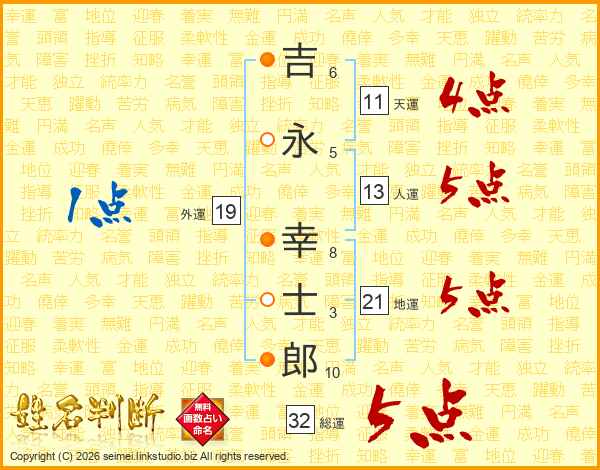吉(6画)永(5画) 幸(8画)士(3画)郎(10画)
