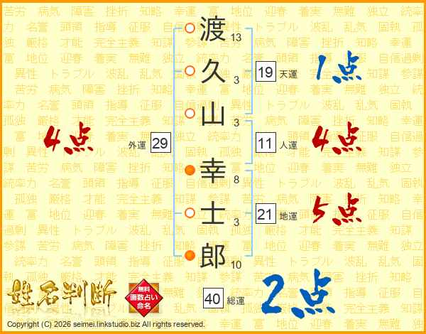 渡(13画)久(3画)山(3画) 幸(8画)士(3画)郎(10画)