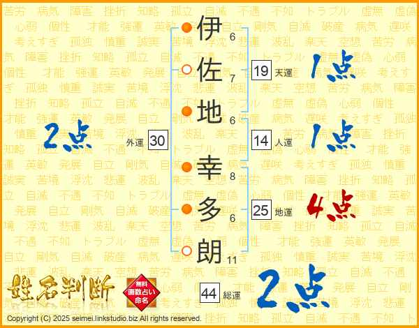 伊(6画)佐(7画)地(6画) 幸(8画)多(6画)朗(11画)