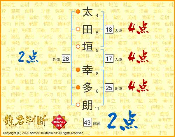 太(4画)田(5画)垣(9画) 幸(8画)多(6画)朗(11画)