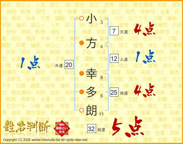 小(3画)方(4画) 幸(8画)多(6画)朗(11画)