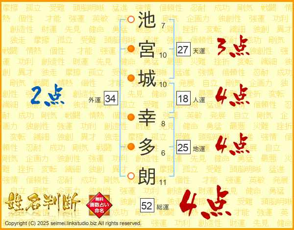 池(7画)宮(10画)城(10画) 幸(8画)多(6画)朗(11画)