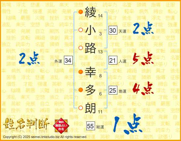 綾(14画)小(3画)路(13画) 幸(8画)多(6画)朗(11画)
