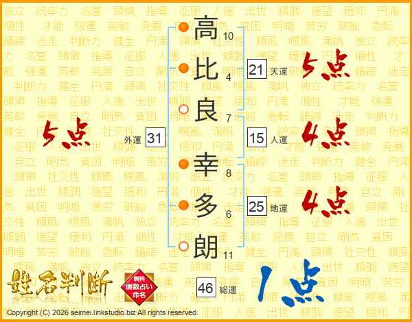 高(10画)比(4画)良(7画) 幸(8画)多(6画)朗(11画)