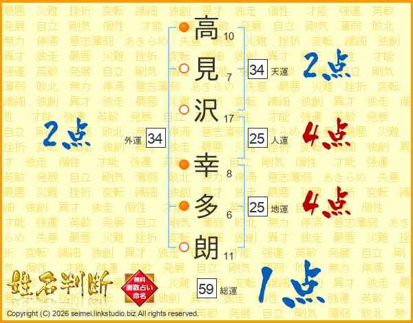 高(10画)見(7画)沢(17画) 幸(8画)多(6画)朗(11画)