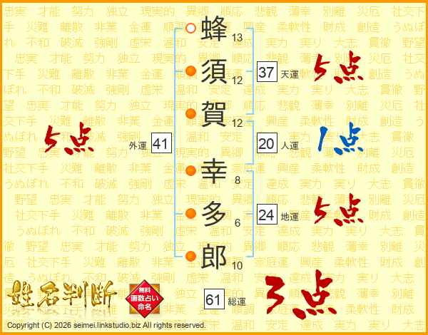 蜂(13画)須(12画)賀(12画) 幸(8画)多(6画)郎(10画)