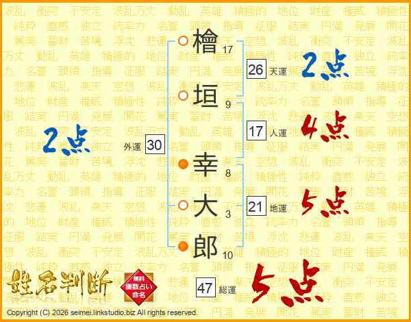 檜(17画)垣(9画) 幸(8画)大(3画)郎(10画)