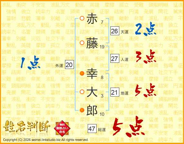 赤(7画)藤(19画) 幸(8画)大(3画)郎(10画)