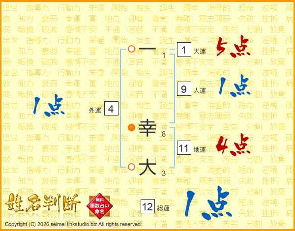 生活面を象徴する運勢です。外部から受ける影響力を表し、結婚運、家庭運や職場、環境への順応性を表します。総運から人運を引いた画数。姓や名が1文字の場合を除く。
