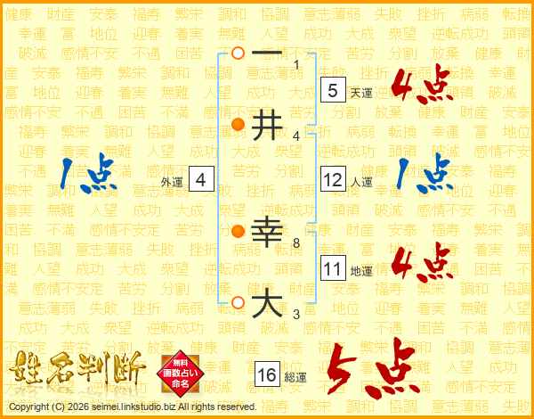 あなたの人生を表す1番重要な運勢です。生涯を通じて影響する総合運となり、主に50歳以降の晩年期に影響を及ぼします。苗字と名前の合計画数。