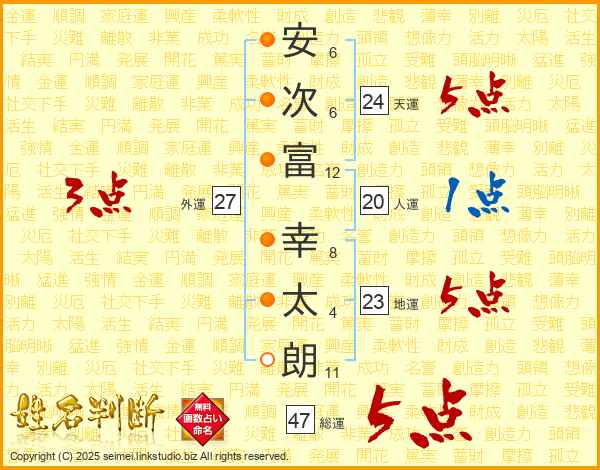 安(6画)次(6画)富(12画) 幸(8画)太(4画)朗(11画)
