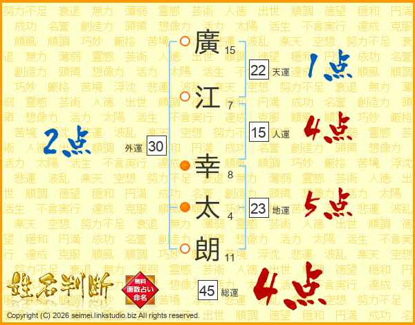 廣(15画)江(7画) 幸(8画)太(4画)朗(11画)