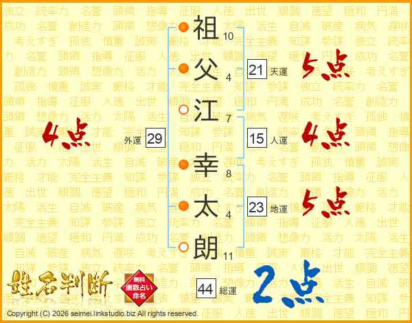 祖(10画)父(4画)江(7画) 幸(8画)太(4画)朗(11画)