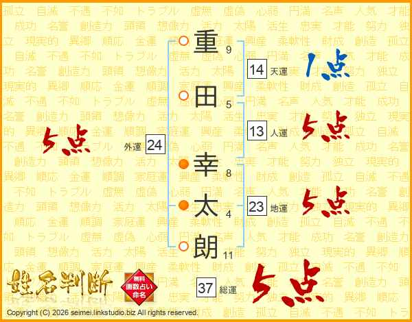 重(9画)田(5画) 幸(8画)太(4画)朗(11画)