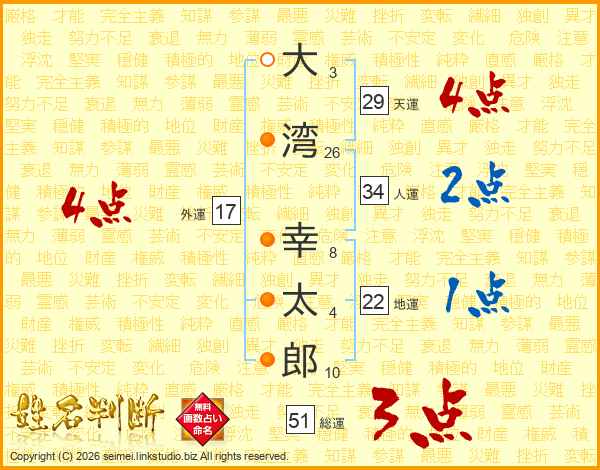 大(3画)湾(26画) 幸(8画)太(4画)郎(10画)