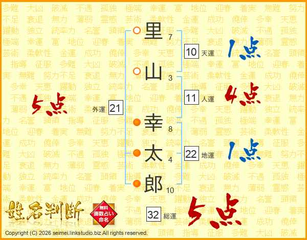 里(7画)山(3画) 幸(8画)太(4画)郎(10画)