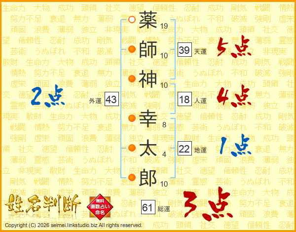 薬(19画)師(10画)神(10画) 幸(8画)太(4画)郎(10画)