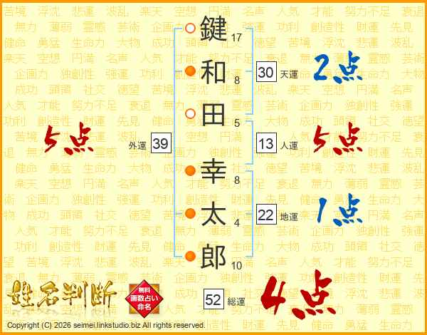 鍵和田幸太郎さんの総運は52画の4点!