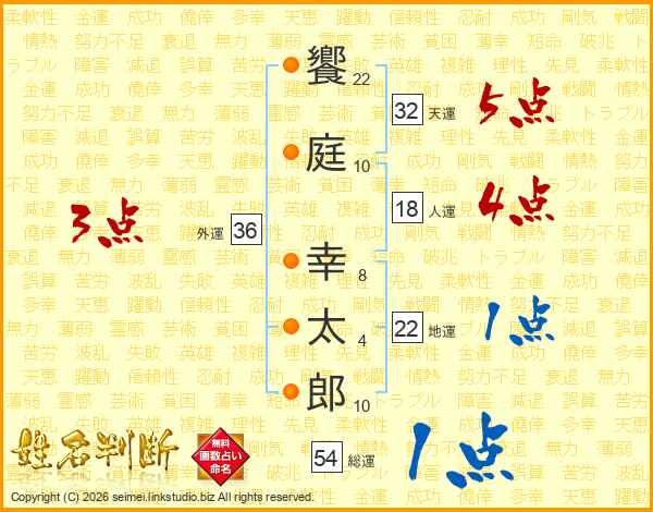饗(22画)庭(10画) 幸(8画)太(4画)郎(10画)