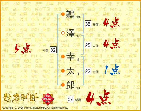鵜(18画)澤(17画) 幸(8画)太(4画)郎(10画)