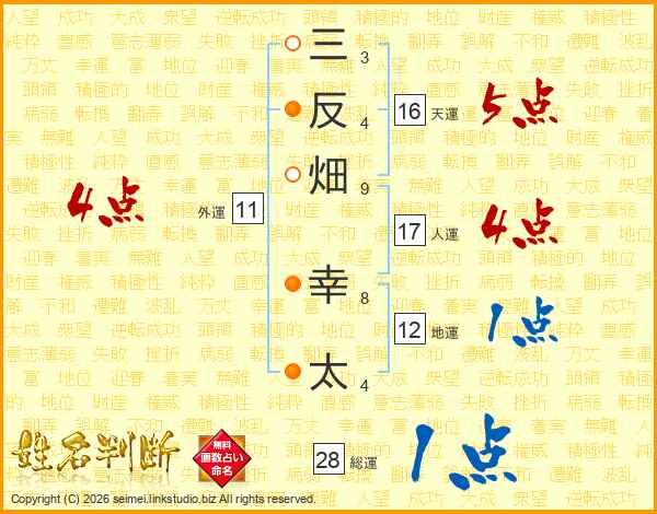 三(3画)反(4画)畑(9画) 幸(8画)太(4画)