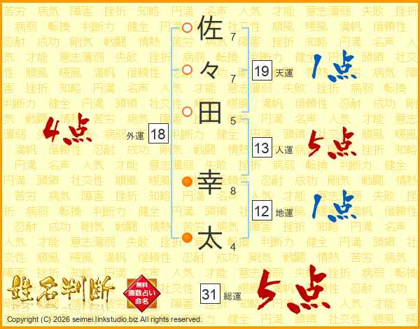 佐(7画)々(7画)田(5画) 幸(8画)太(4画)