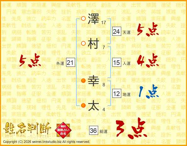 澤(17画)村(7画) 幸(8画)太(4画)