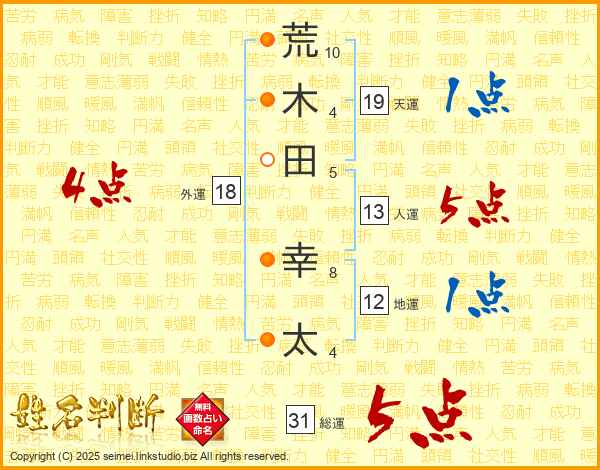荒(10画)木(4画)田(5画) 幸(8画)太(4画)