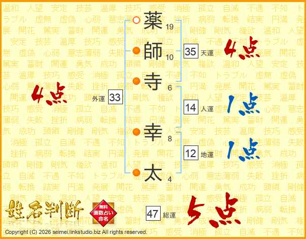 薬(19画)師(10画)寺(6画) 幸(8画)太(4画)