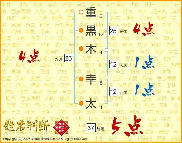 重(9画)黒(12画)木(4画) 幸(8画)太(4画)