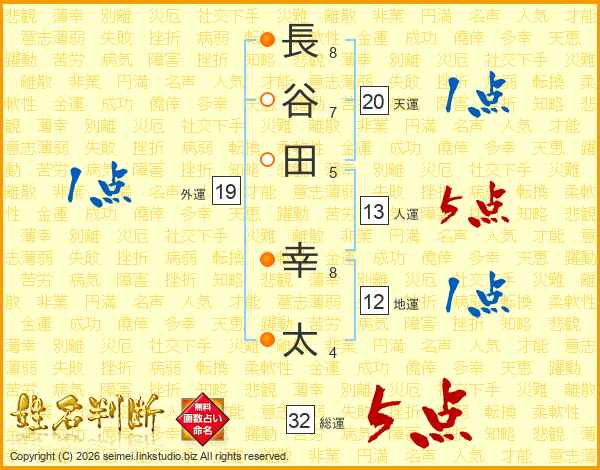 長(8画)谷(7画)田(5画) 幸(8画)太(4画)
