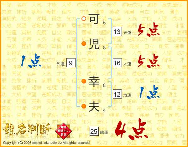 可(5画)児(8画) 幸(8画)夫(4画)